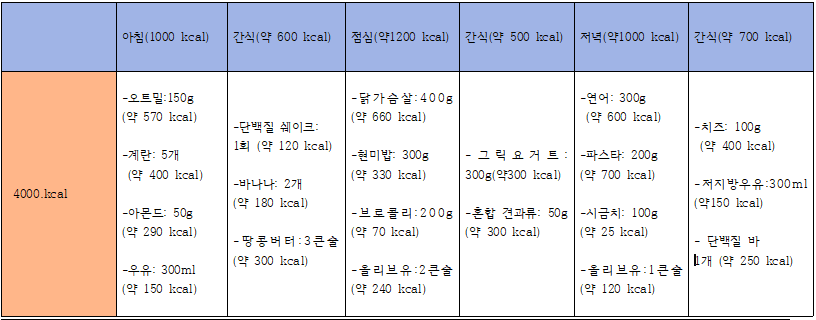 예를 들어, 하루 총 섭취 칼로리가 4000 칼로리인 경우