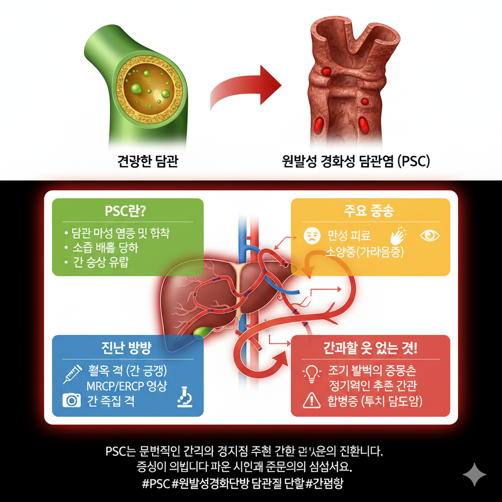 원발성 경화성 담관염(PSC)은 간 내외에 있는 담관(쓸개관)에